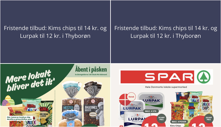 Hos Min Købmand kan du forkæle dig selv med Kims chips, snacks eller nødder til kun 14 kr. pr. pose. Vælg mellem flere varianter med en vægt på 80-235 g. Bemærk, at der er en begrænsning på 4 poser pr. kunde pr. dag. Tilbuddet gælder fra fredag den 27. marts til lørdag den 4. april.